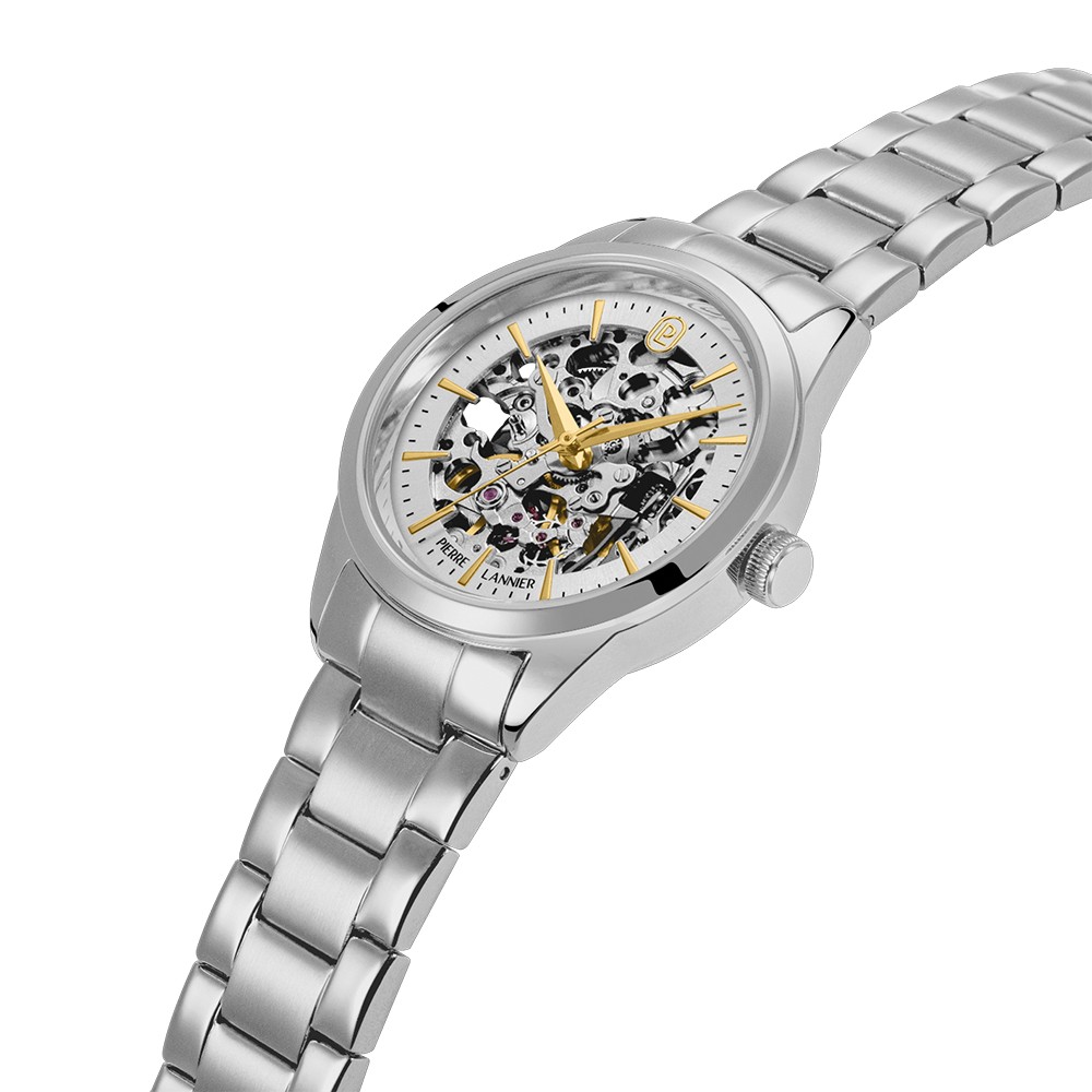 Die Uhr Thea 143H621 offenbart ihr mechanisches Herz mit einem eleganten Skelett-Zifferblatt. Ihr rundes 35,5 mm Gehäuse aus silbernem Edelstahl und das passende Armband verkörpern feminine Eleganz Made in France.